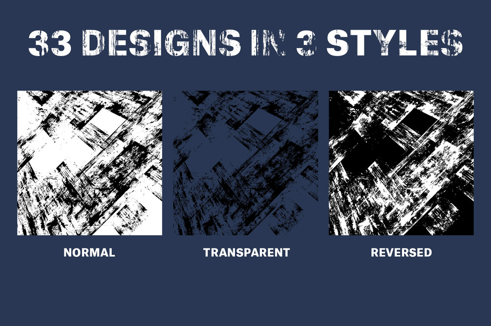 This product download contains 99 files. Destroy your designs with our Scratched pack. This collection of 33 distressed overlays is sure to deliver the perfect touch of grunge and grime to your next project. All files are high resolution that can be dragged, dropped and recolored in your editing software of choice. There are 33 designs in 3 variations normal, reversed and with a transparent background.
